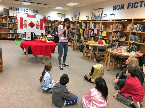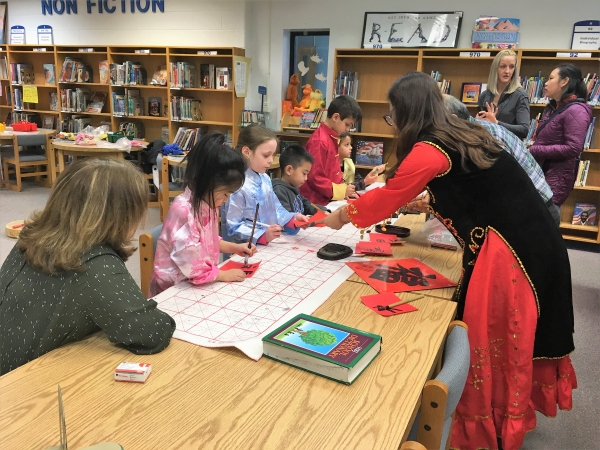 “春节到,福气到”笔墨丹青写福字。小学生用毛笔一笔一划描摹出“福”的字样,学生家长对此次活动也十分重视,和孩子一起尝试写毛笔字。其中小学生娜菈(Nora)说“要把红福字贴在自己的床头,这样当她睡觉的时候怪兽就不会来了。”今年是狗年,小朋友竞相地背数十二生肖,看到苏汉(Sohan)绞尽脑汁地想十二生肖,其他小朋友忙做动作帮助他回忆起来,一下子变成了“你做我猜”的游戏。 新春活动最让小学生感到兴奋的非发红包莫属,顾老师讲述发红包传统习俗并作为这间教室的长者为学生们发红包,发的是美国政府每年限量发放的幸运红包,每个红包里面不仅讲述了狗年含义的故事,还有一张以8888开头讨彩头的一美元现金。小学生先预习了“新年快乐”、“恭喜发财”、“万事如意”等新春祝福语,当发放红包时学生们大声地说“谢谢”、“新年快乐” 。除了发红包,还给小学生发了幸运饼干、糖果。最后随着“恭喜发财”的音乐大家一起进行舞狮表演,精彩的音乐舞狮将活动推向了高潮。